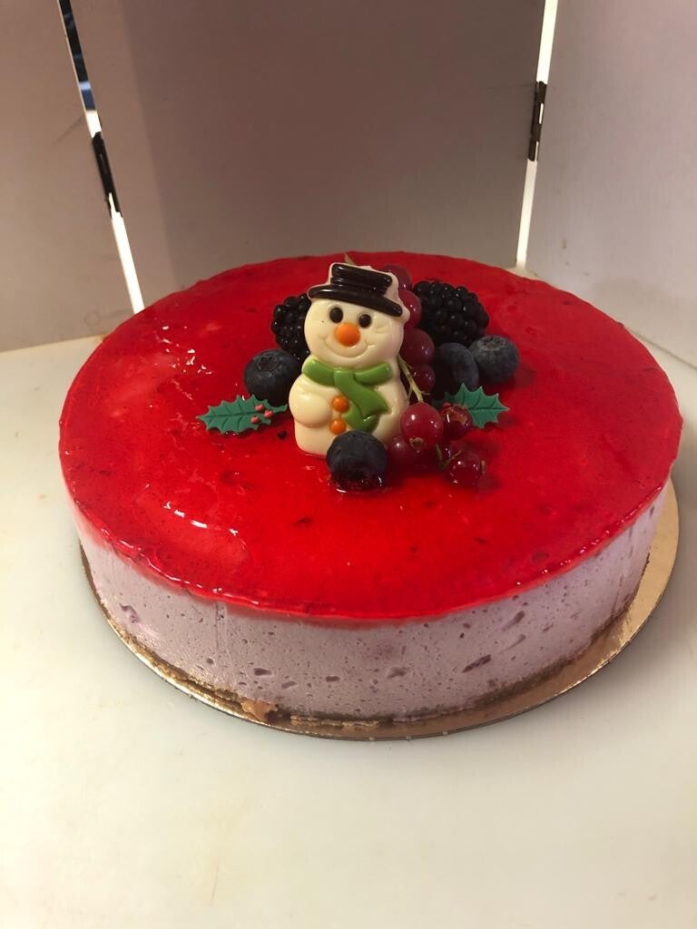 Een heerlijke Bavaroise Taart. Verse Bosvruchten bavaroise op cake en Caramelkoek. Afgegoten met Bosvruchten gelei en afgewerkt met Verse Bosvruchten en Kerst decoratie. Prijs is voor een 8 persoonstaart. (20 cm doorsnede) Heerlijk als dessert, maar ook bij de koffie..