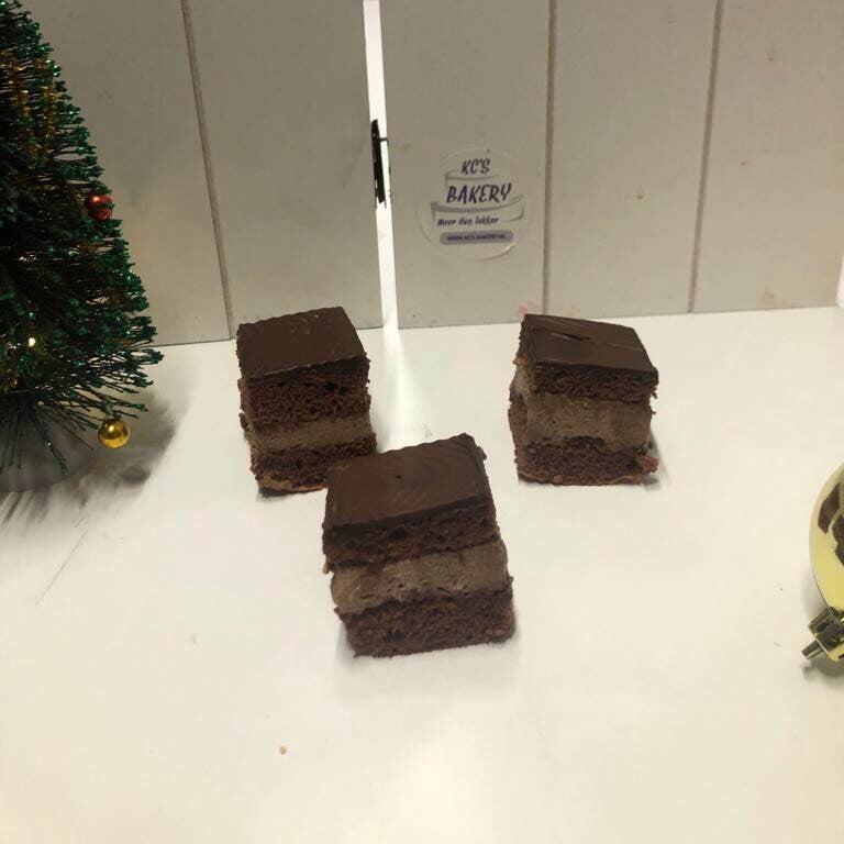 Choclade cake stukjes van 4 x 4 cm. Luchtige Chocolade cake, gevuld met Chocolademousse en afgewerkt met Choclade Ganache. Heerlijk als en bij het dessert, maar ook bij de koffie natuurlijk.