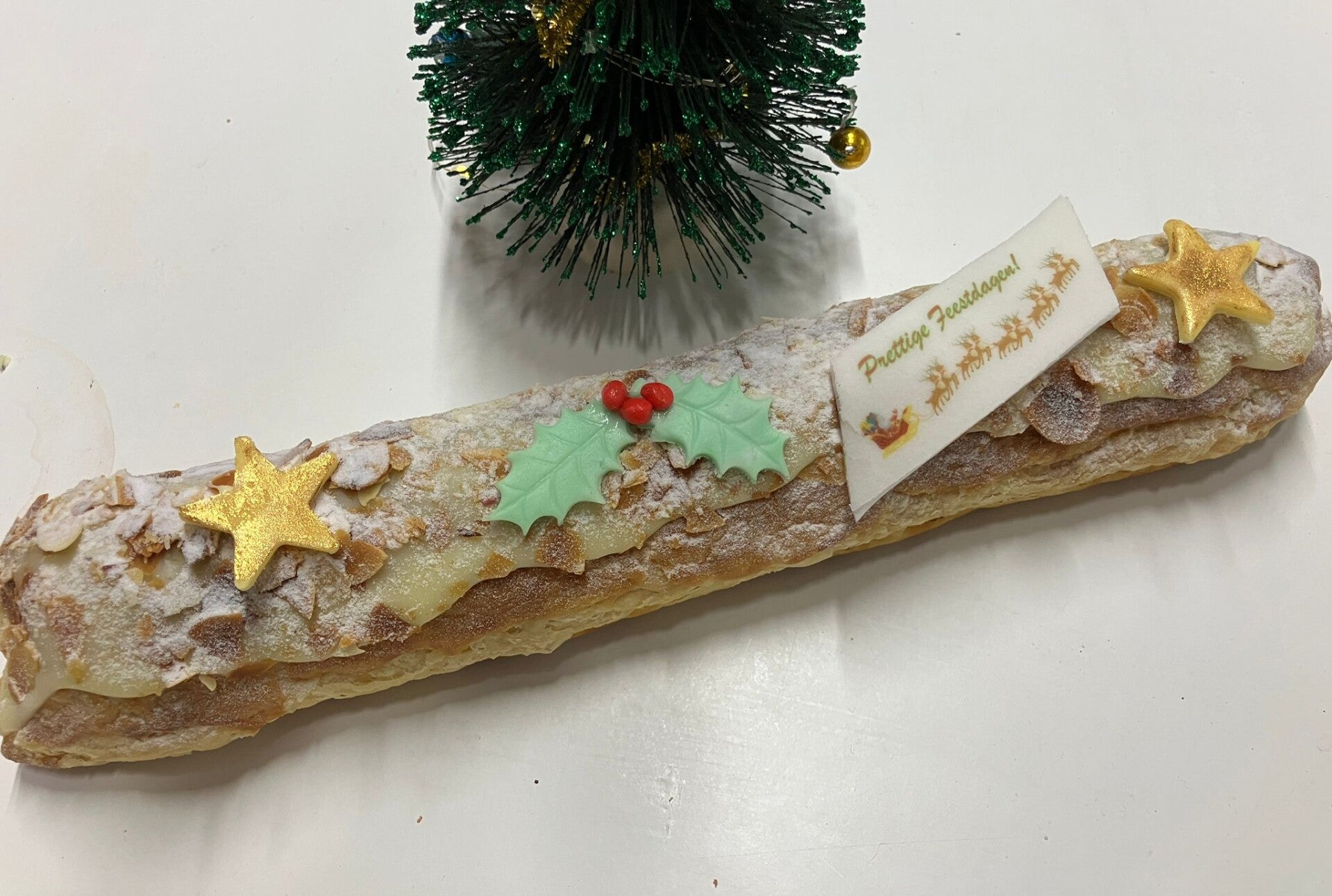 Een 500 grams Roomboter Kerststaaf, gemaakt van Roomboter bladerdeeg, gevuld met echte Amandelspijs. Daarnaast is deze opgemaakt met witte Chocolade Ganache, Gebrande Amandelschaafsel, Marsepein decoratie en decoratiesneeuw (deze kunnen afwijken)