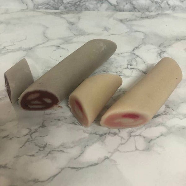 Staven Marsepein in het model van Bloed- en leverworst. Verpakt in seal