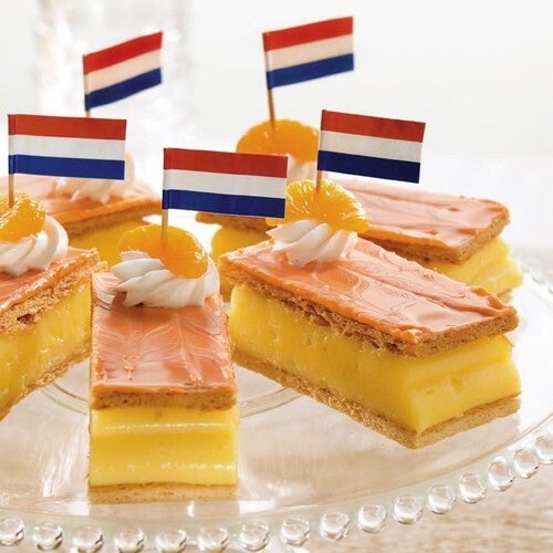 Roomboter bladerdeeg, lekkere gele Banketbakkersroom en zoete oranjefondant, afgetopt met verse Slagroom en een mandarijntje.