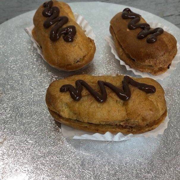 Een Eclair van een 5 cm gevuld met Chocolade Creme en Chocolade frosting daarna afgewerkt met Pure Chocolade
